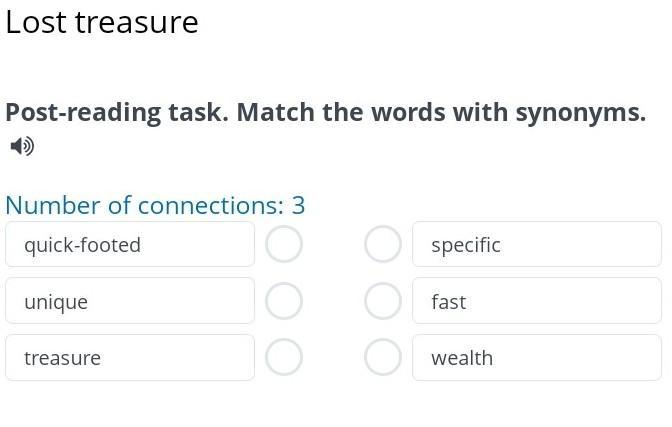 Post-reading task. Match the words with synonyms. Number of connections: 3 quick-footed unique treasure Ospecific OF OG fast wealth