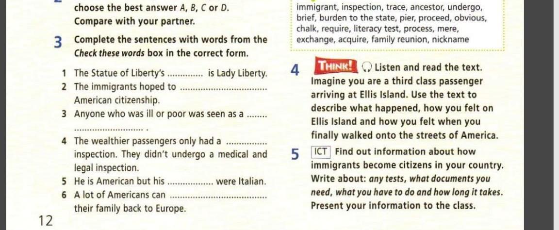 3 Complete the sentences with words from the Check these words box in the correct form. 1 The Statue of Liberty's..............is Lady Liberty. 2 The immigrants hoped to American citizenship. 3 Anyone who was ill or poor was seen as a 4 The wealthier passengers only had a inspection. They didn't undergo a medical and legal inspection. 5 He is American but his ................... were Italian. A lot of Americans can 6 their family back to Europe.