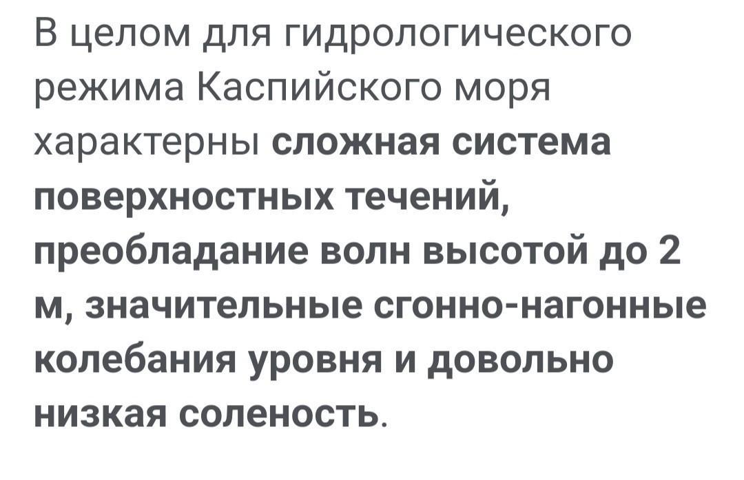 для гидрологического режима Каспийского моря характерны сложная система поверхностных течений, преобладание волн высотой до 2 м, значительные сгонно-нагонные колебания уровня и довольно низкая соленость.