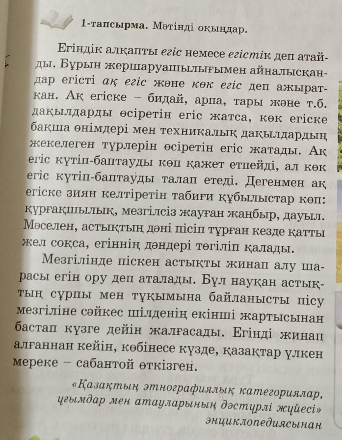А Мәтін бойынша төмендегі тапсырмаларды орындаңдар. 1. Мәтінде жоқ ақпаратты табыңдар. Егістің түрлері/егін жинаудың ерекшеліктері/егінге қауіпті жағдайлар