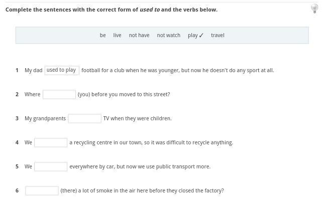 1)My dad used to play football for a club when he was younger, but now he doesn't do any sport at all.