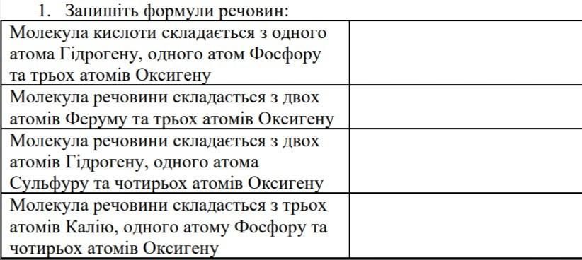 Молекула речовини складається з двох атомів Гідрогену, одного атома Сульфуру та чотирьох атомів Оксигену