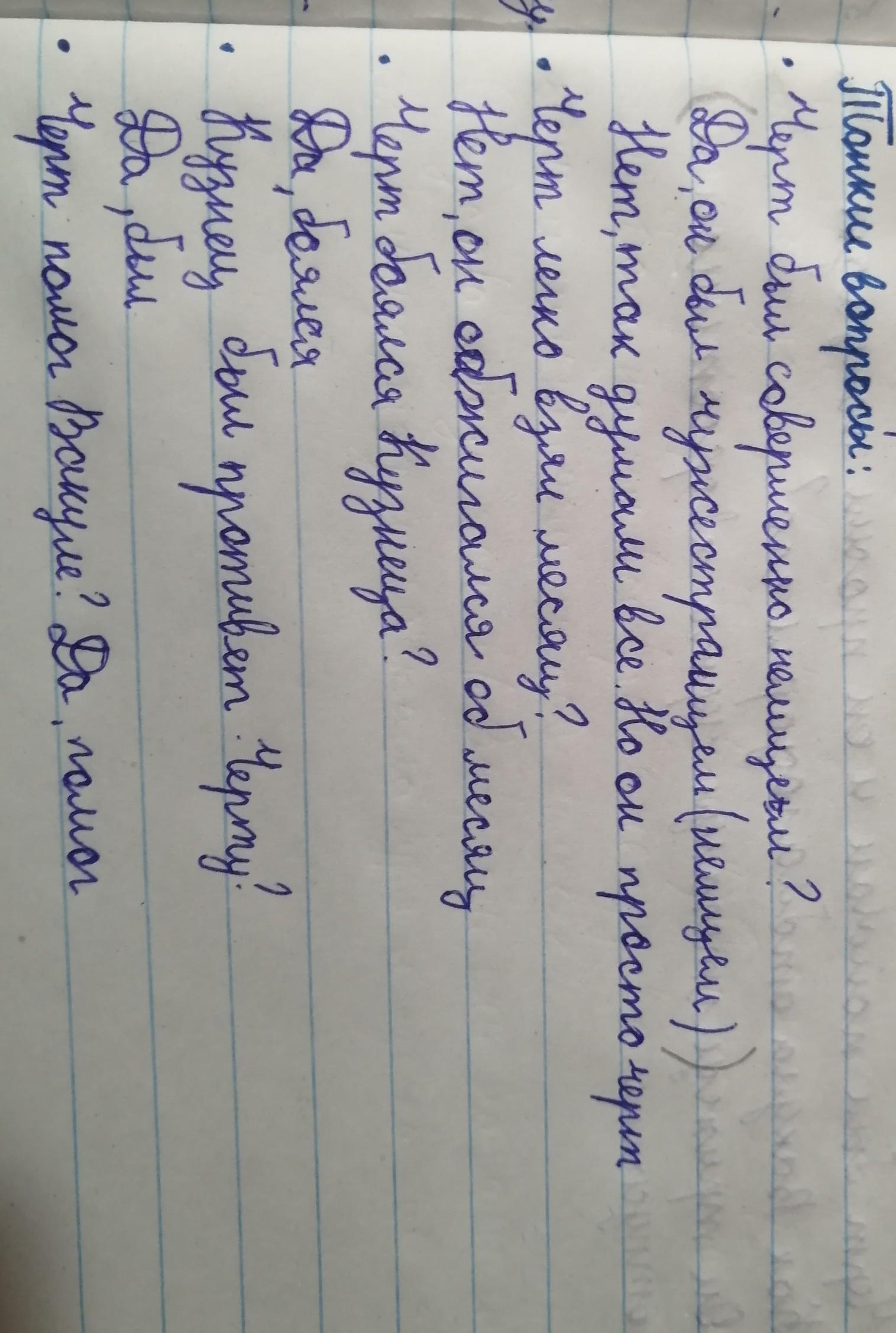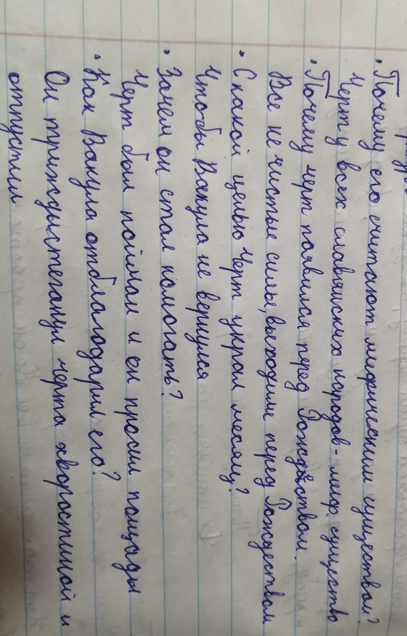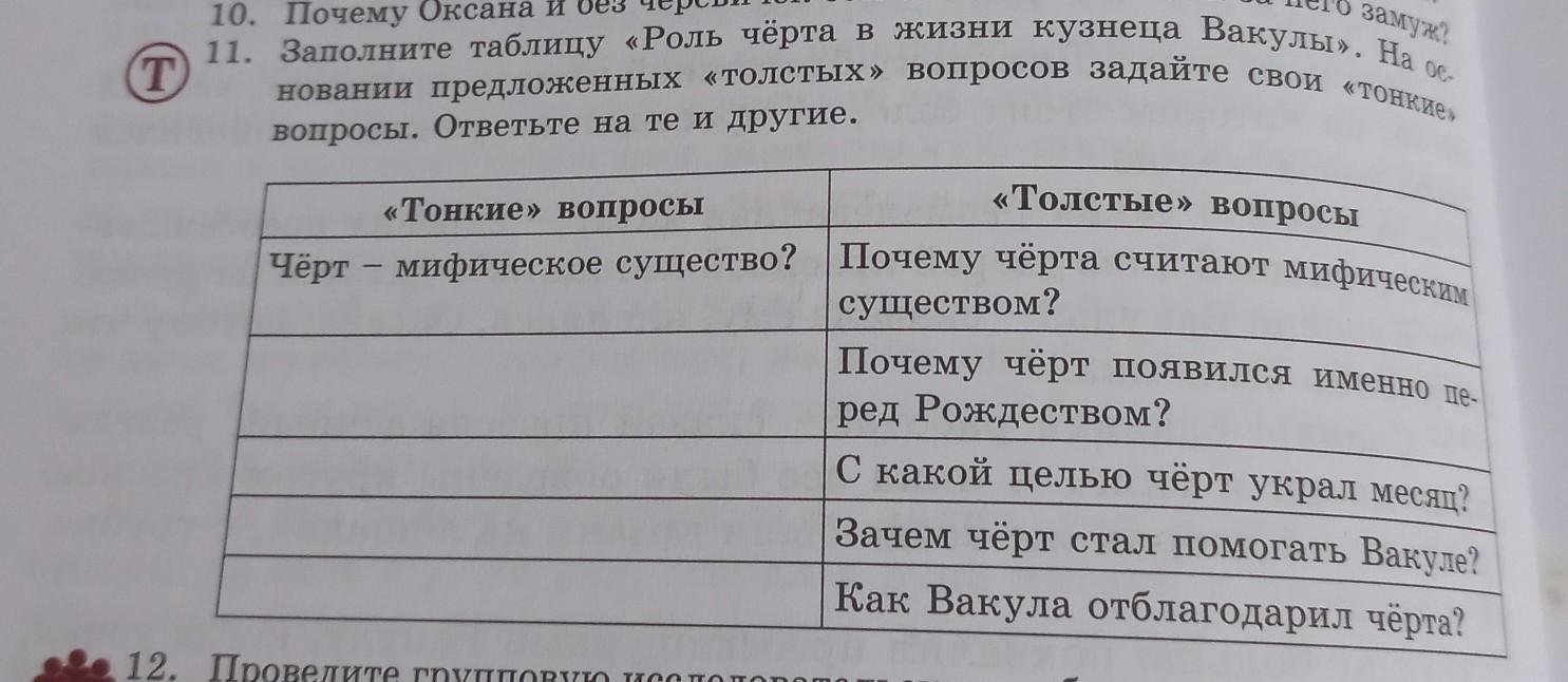 11. Заполните таблицу «Роль черта н новании предложенных толстых вопросов задайте свои тонкие вопросы. Ответьте на те и ДРУГИЕ- «Толстые» вопросы «Тонкие>> вопросы Чёрт - мифическое существо? Почему чёрта считают мифическим существом? Почему чёрт появился именно пе- ред Рождеством? С какой целью чёрт украл месяц? Зачем чёрт стал помогать Вакуле? Как Вакула отблагодарил черта?