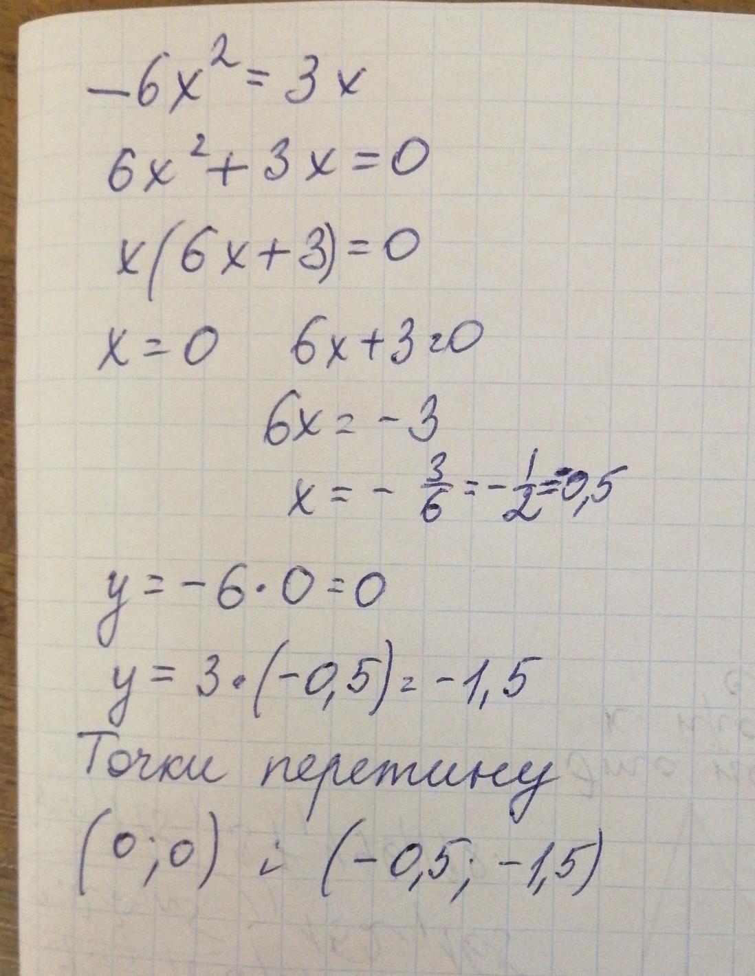 Не використовуючи побудови, знайдіть координати точок перетину графіків функцій у = - 6х² і у = 3х.