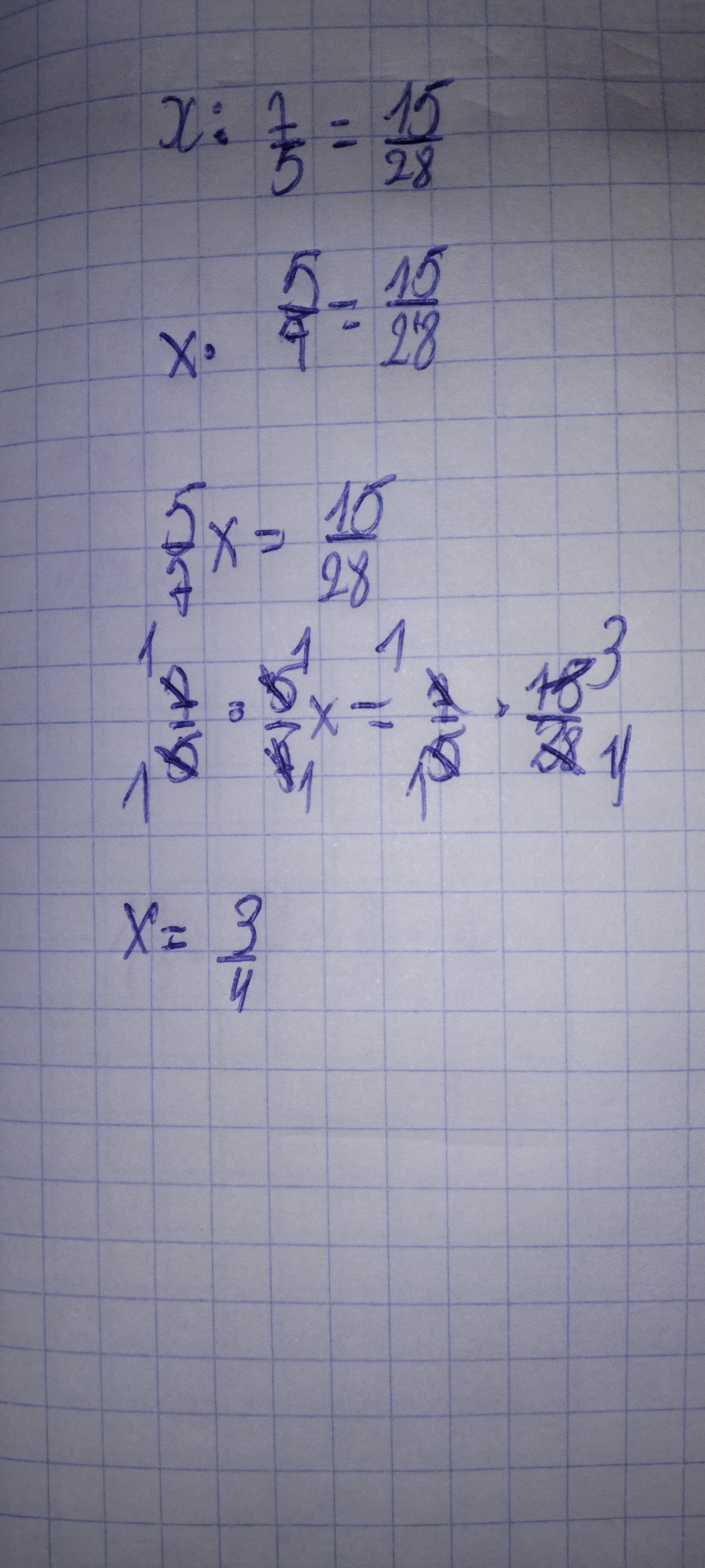 х÷7/5 = 15/28 | х = 15/28÷7/5| х=75/196, перевіряємо: 75/196÷7/5 = 75/196×5/7 = 75×5/196×7 = 375/1372 = 15/28