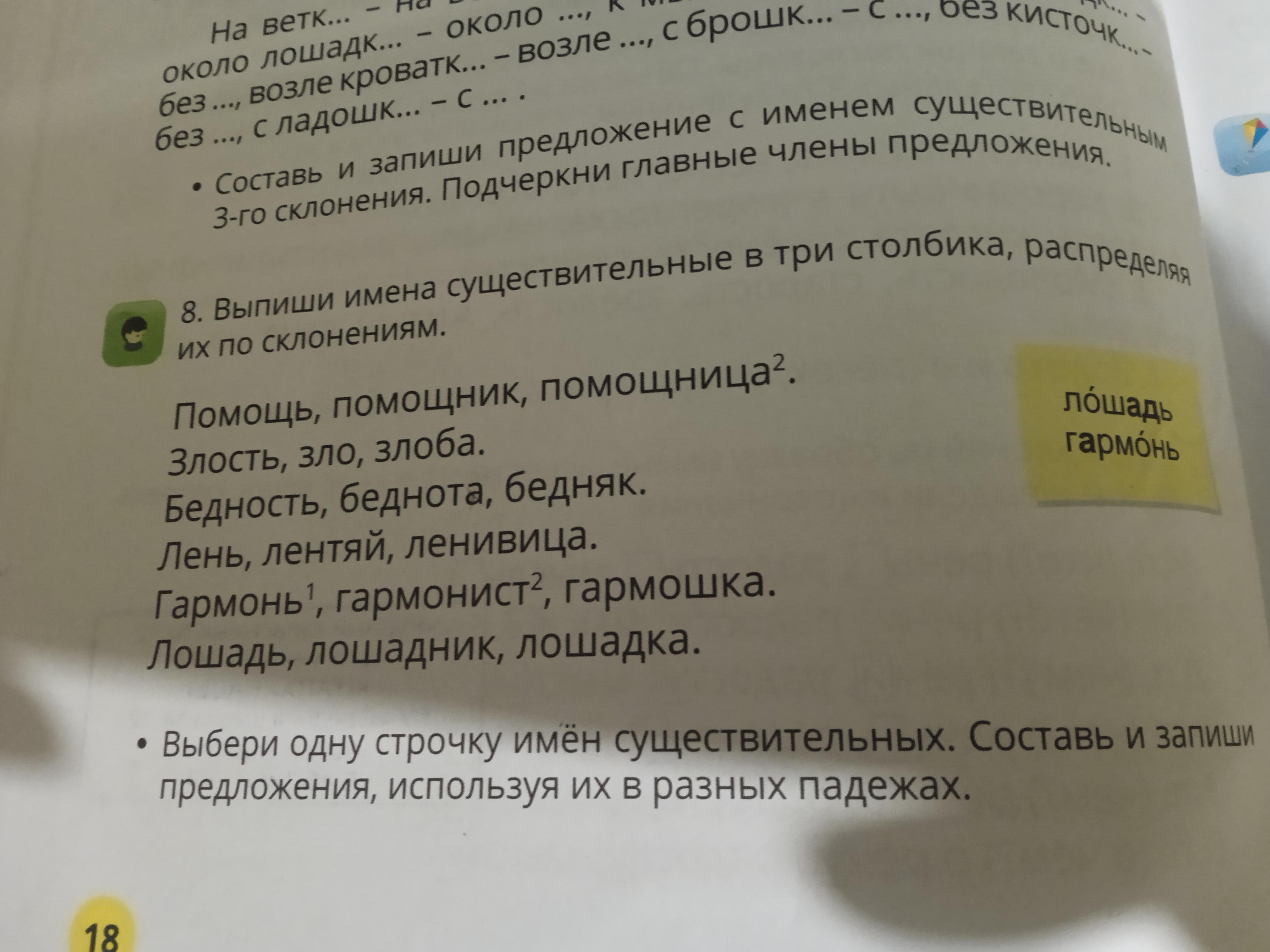 Выбери одну строчку имён существительных. Составь и запиши предложения, используя их в разных падежах (слова и задание в фото)