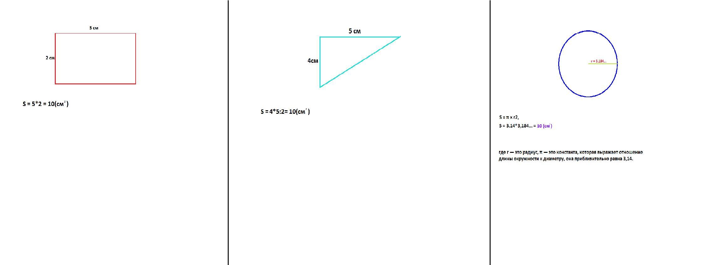47. Нарисуйте три разные фигуры так, чтобы площадь каждой фигуры была 10 см. Сделайте необходимые замеры и рассчитайте периметр каждой фигуры. Что можно сказать о периметрах?