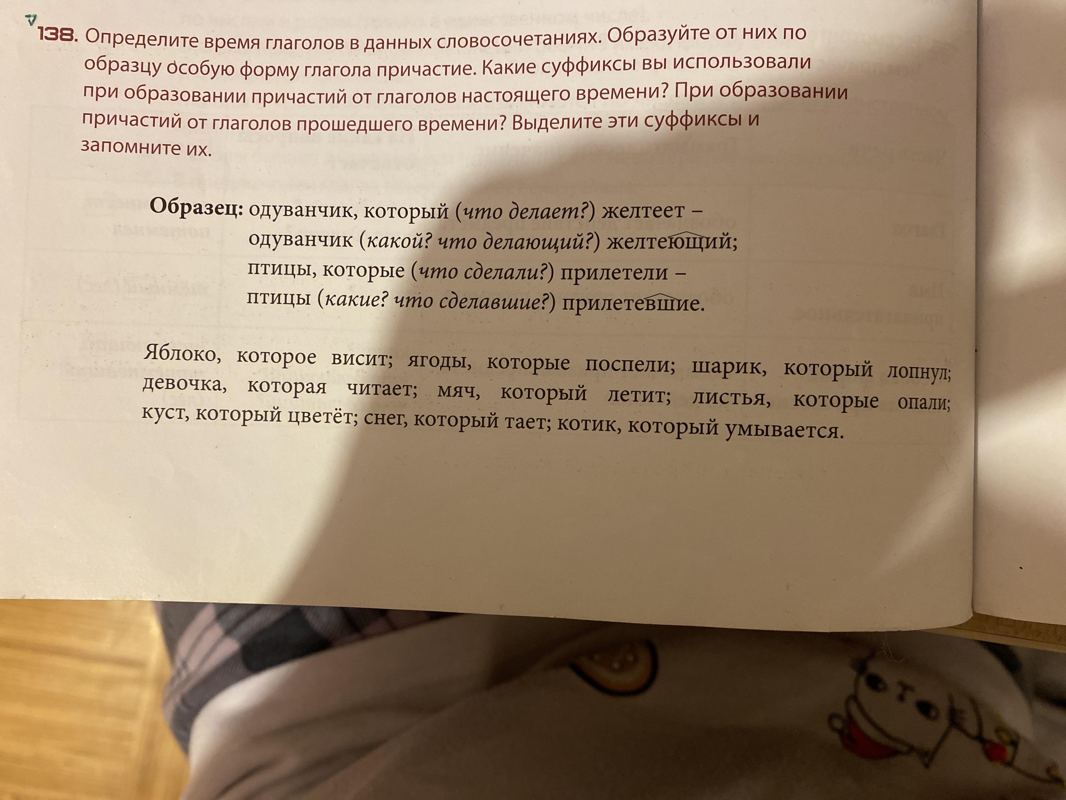 При образовании причастий настоящего времени используются суффиксы -ущ-, -ющ- для первого спряжения и -ащ-, -ящ- для второго спряжения. При образовании причастий прошедшего времени используются суффиксы -вш-, -ш-.