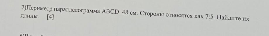 7)Периметр параллелограмма АBCD 48 см. Стороны относятся как 7:5. Найдите их длины. [4]