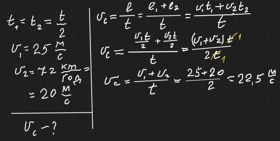 Знайти середню швидкість тіла, якщо відомо, що першу половину часу воно рухалося зі швидкістю 25 м/с, а другу половину часу зі швидкістю 72 км/год.