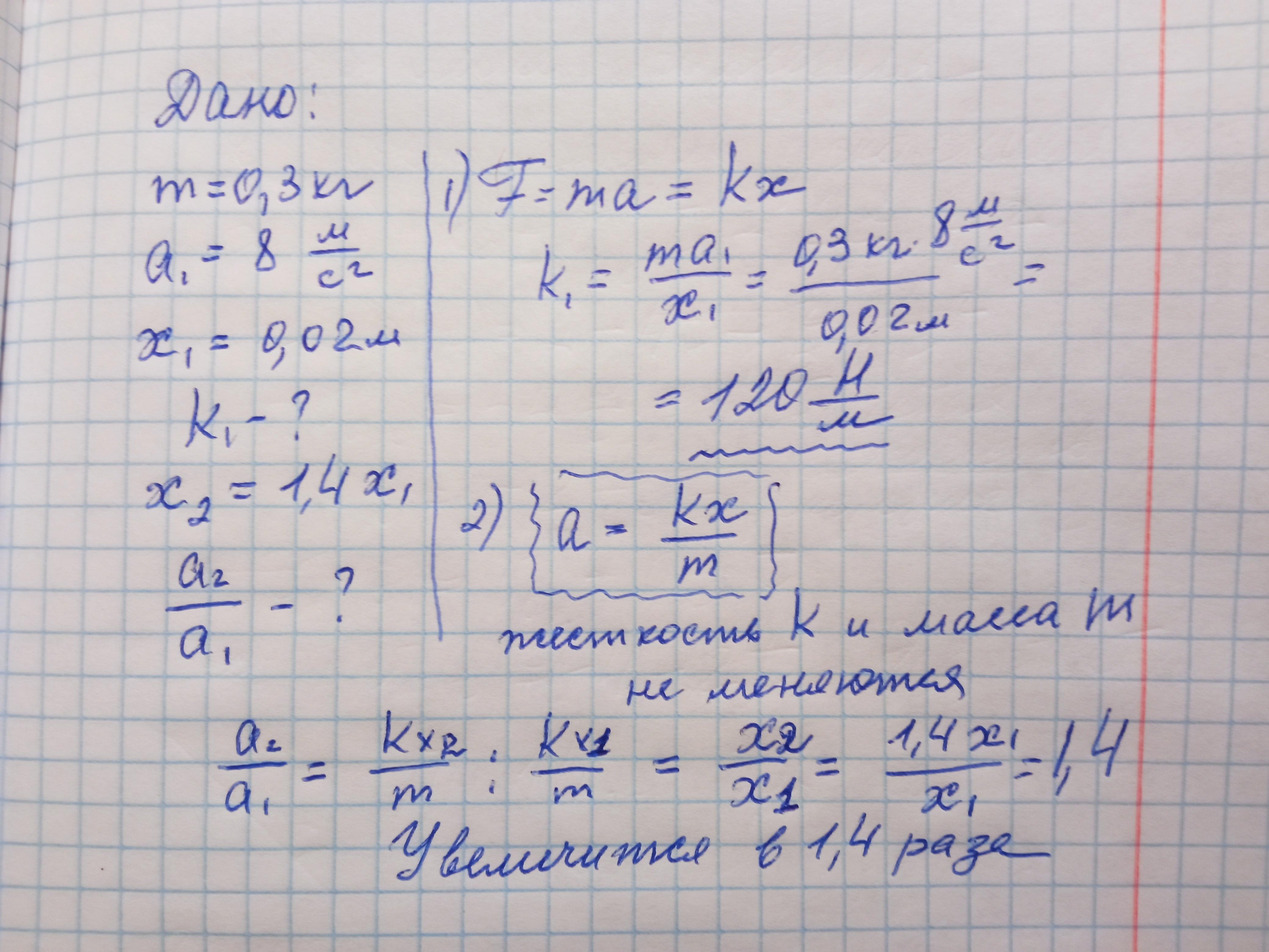 Брусок массой 0,3 кг находится на гладком горизонтальном столе. К бруску прикрепляют пружину жёсткостью k(Н/м) и, потянув за пружину, приводят брусок в движение. При движении бруска с ускорением 8,0 м/с^2 пружина деформируется на длину 2 см. Определите значение k (жёсткость пружины). Во сколько раз изменится ускорение бруска, если деформация пружины увеличится в 1,4 раза.