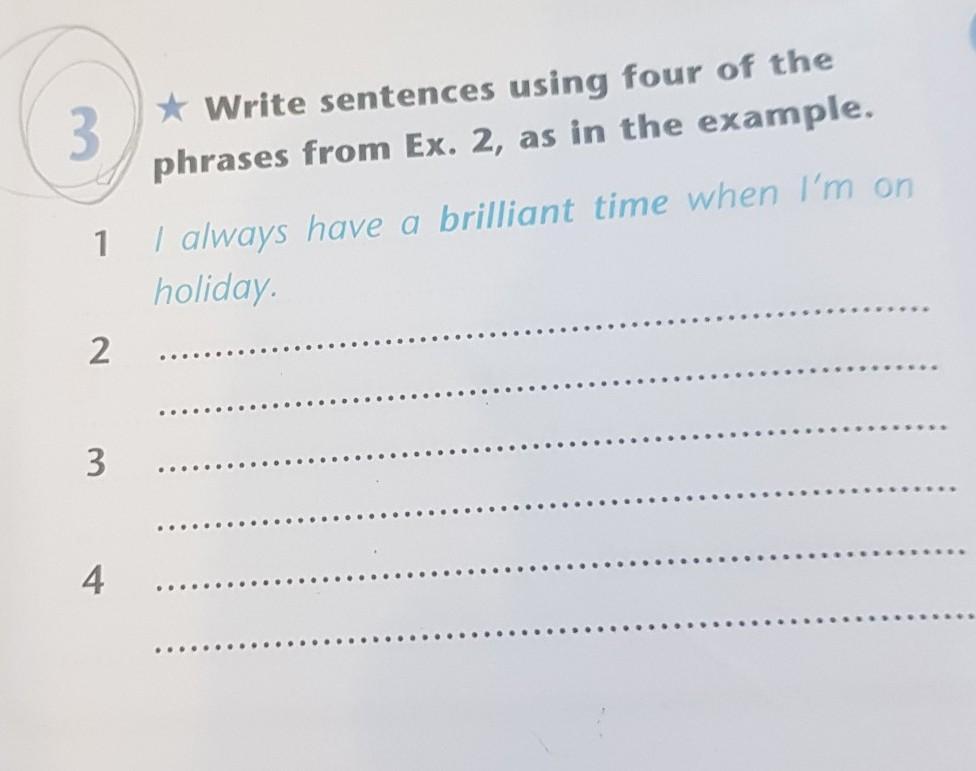 3 *Write sentences using four of the phrases from Ex. 2, as in the example. 1 I always have a brilliant time when I'm on holiday. 2 3 4