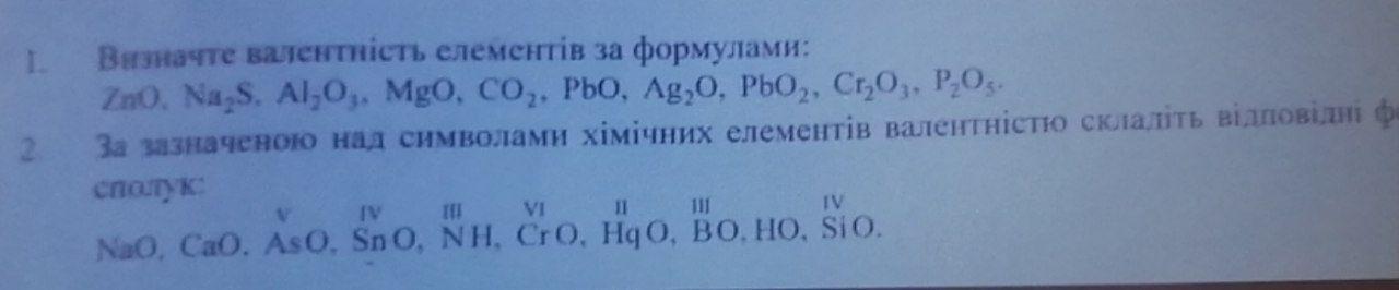 1. Визначте валентність елементів за формулами: ZnО, Na2S. Al2O3, MgO, CO2, PbO, Ag,O, PbO2, Cr203, P203. За зазначеною над символами хiмiчних елементiв валентнiстю склалiть відповідні сполук V IV Ш VI II IV NaO, CaO. AsO, SnO, NH, CrO, HqO, BỎ. HỌ, SiO.
