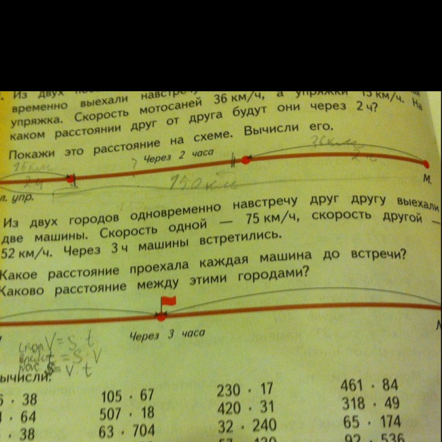 Из двух городов одновременно навстречу друг другу выехали две машины. Скорость одной-75км/ч,скорость другой-52км/ч. Через 3 ч. Машины встретились. 1)какое расстояние проехала каждая машина до встречи? 2)каково расстояние между этими городами? Помогите, завтра сдавать!!!Заранее спасибо!!