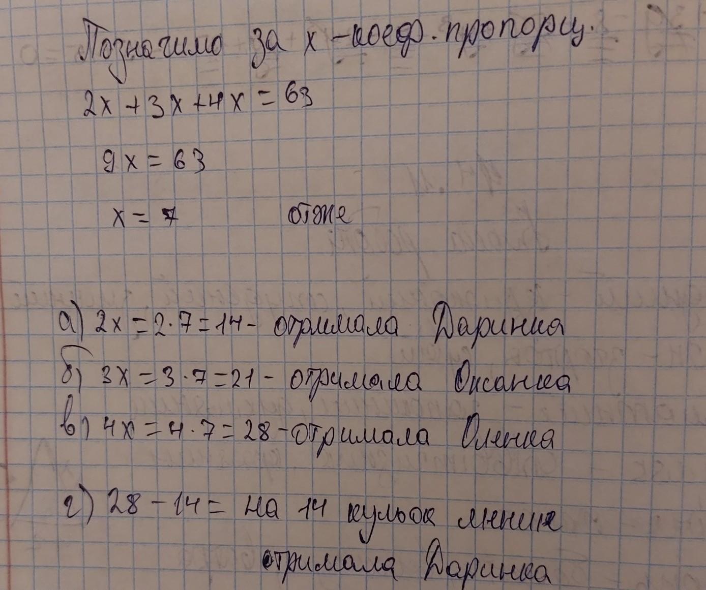 Завдання (виконай у робочому зошиті) Розв'яжи задачу. а) Даринка, Оксанка й Оленка поділили між собою 63 кульки у відношенні 2 : 3 : 4 відповідно. Скільки кульок отримала кожна дівчинка? На скільки менше кульок отримала Даринка, нiж Оленка?