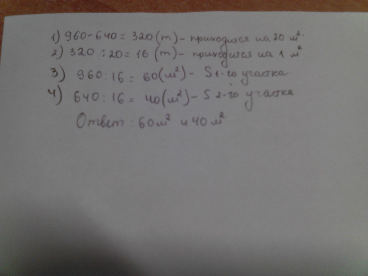 Пожалуйста решите эту задачу! Кто напишет решение полным, понятным и правильным, отмечу решение лучшим! Буду очень благодарна! На двух опытных участках высадили тюльпаны: на одном 960 луковиц, на другом 640 луковиц. На каждом квадратном метре высаживали одинаковое число луковиц. Площадь первого участка была на 20 м (кв) больше, чем площадь второго. Чему равна площадь каждого участка?