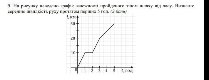 На рисунку наведено графiк залежності пройденого тілом шляху від часу. Визначте середню швидкість руху протягом перших 5 год. (2 бали) 1, км 4