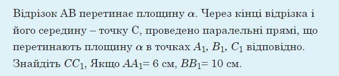 Отрезок АВ пересекает плоскость a. Через концы отрезка и его середину – точку С, проведены параллельные прямые, пересекающие плоскость a в точках А1, В1, С1 соответственно. Найдите СС1, если АА1 = 6 см, ВВ1 = 10 см.