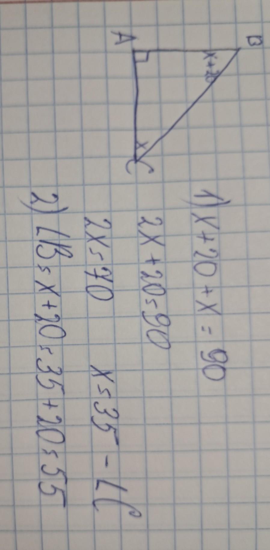 847. Один iз гострих кутів прямокутного трикутника на 20° бiль- ший, ніж другий. Знайди міри цих кутів.