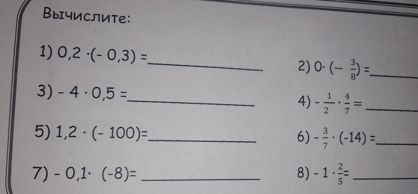 Вычислите: 1) 0,2 (-0,3)= 3) - 4-0,5 = 5) 1,2 (100) 7) -0,1- (-8)= 2) 0 ( 6) -- (-14) 8)-1*2/5