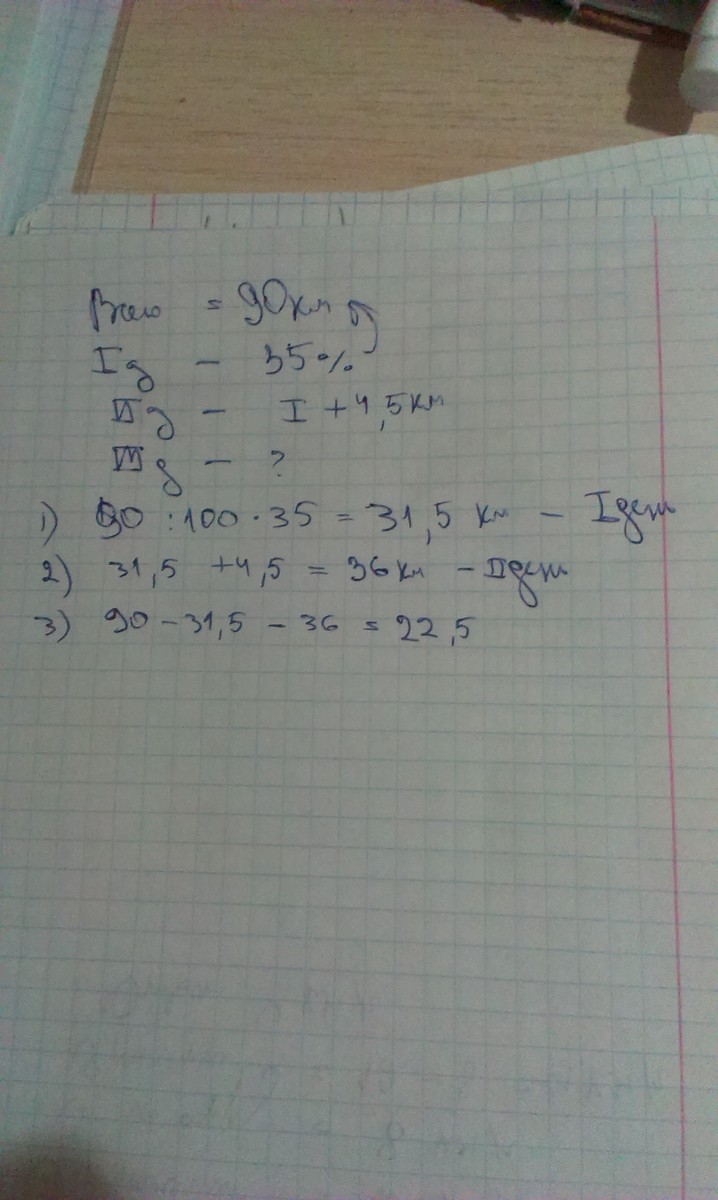 Турист должен пройти 90 км. за первый день он прошел 35% пути, за второй день на 4,5 км больше, чем в первый день. Сколько % пути осталось пройти туристу после этого?