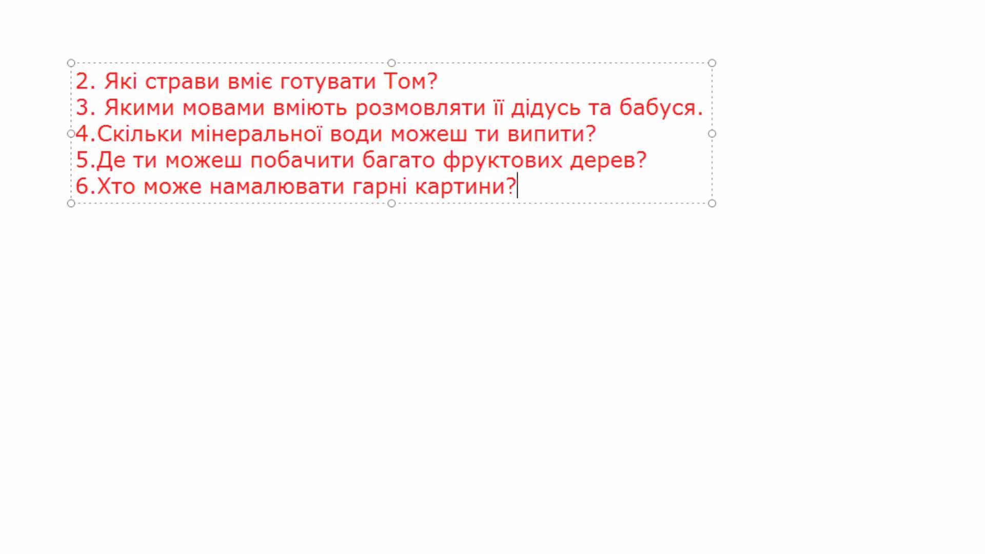 What kind of food can Tom cook? On what language can grandma and grandpa speak? How much mineral water can you drink? Where you can see many fruit trees? Who can drow beautiful pictures?