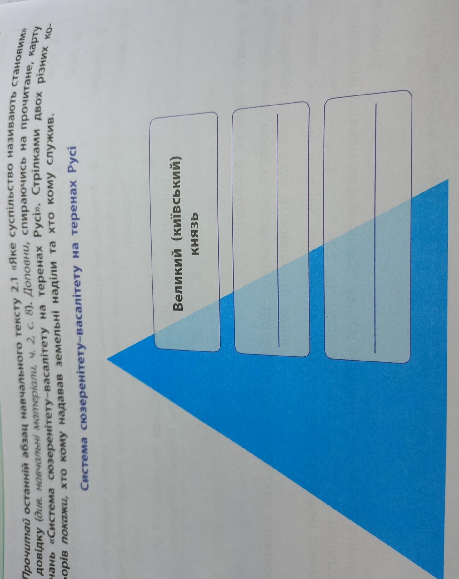 4.3. Прочитай останній абзац навчального тексту 2.1 Яке суспільство називають становим знань «Система сюзеренітету-васалітету на теренах Русі». Стрілками двох різних ко- і довiдку (див. навчальні матеріали, ч. 2, с. 8). Доповни, спираючись на прочитане, карту льорiв покажи, хто кому надавав земельні наділи та хто кому служив. Система сюзеренітету-васалітету на теренах Русі Великий (киïвський) князь Срочнооо дам 20 балов