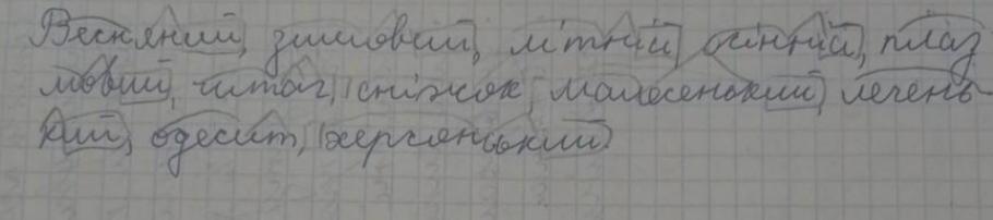 132.1. Спишіть слова, позначте в них корені, суфікси, закінчення. Весняний, зимовий, літній, осінній, плазмовий, читач, сні- жок, одесит, херсонський, подо- рожнiй, комп'ютерний. II. Складіть і запишіть речення з одним iз поданих слів (на вибір).