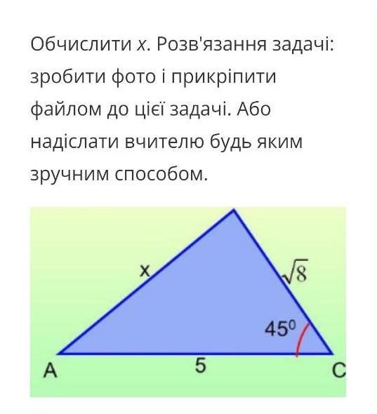Обчислити х. Розв'язання задачі: зробити фото і прикріпити файлом до цієї задачі. Або надіслати вчителю будь яким зручним способом. A + 5 √8 45⁰ C