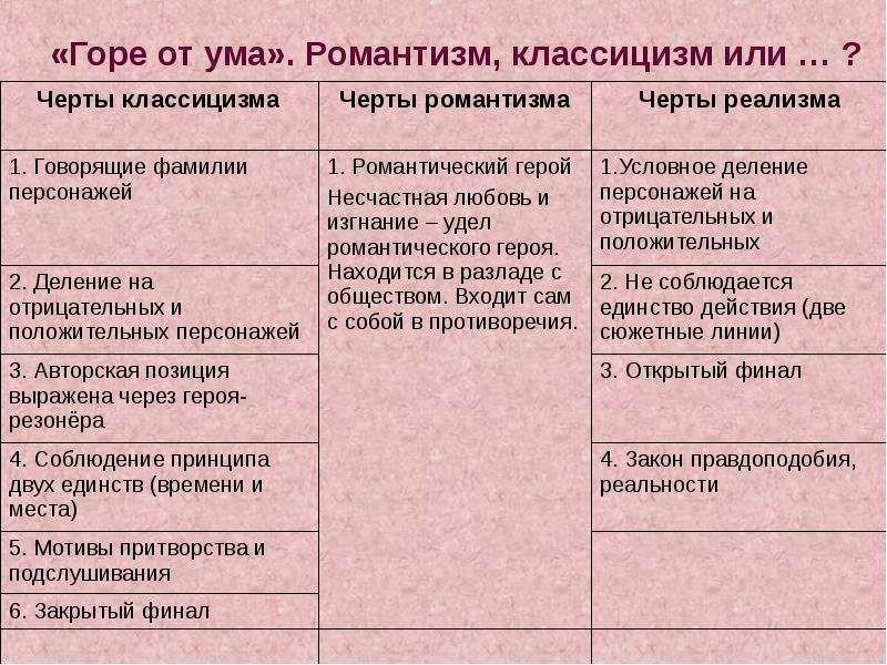 Сделать таблицу по произведения "горе от ума". Три таблички: классицизм, романтизм, реализм ,- и записать внутри них те черты, которые встречаются в произведении.