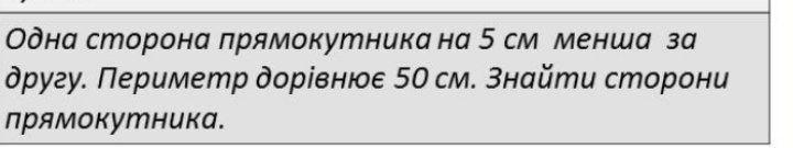 Нехай х см – одна сторона прямокутника, тоді (х-5) см – інша. Знаючи, що P = 14 см, сост. ур-ие