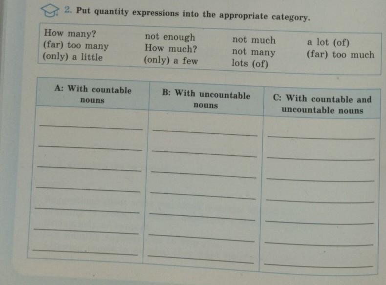 2. Put quantity expressions into the appropriate category. How many? not enough How much? (far) too many (only) a little (only) a few A: With countable nouns not much not many lots (of) B: With uncountable nouns a lot (of) (far) too much C: With countable and uncountable nouns