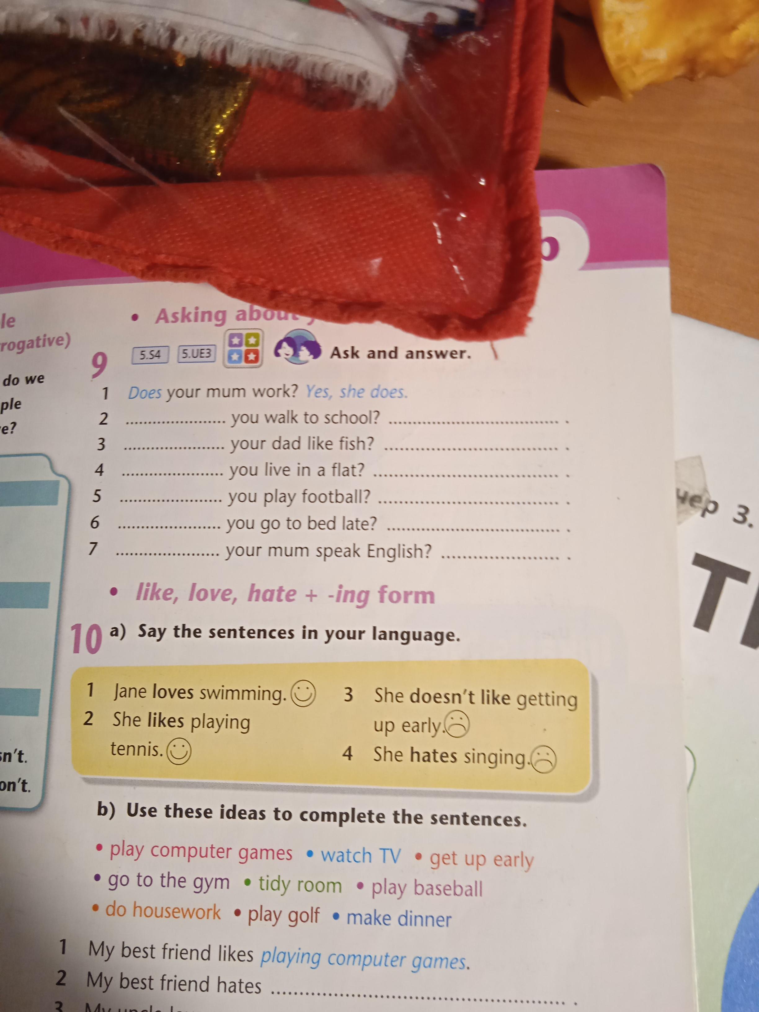 1.Do you walk to school? Yes I do. 2.Does your dad like fish? Yes he like. 3. Do You live ın a flat? Yes, I do, 4.Do you play football? Yes, I do. 5.Do you go to bəd late. Yes, I doing. 6.Does your mum speak English? Yes, she does. (в отрицательной форме Do-Dont, Does-Doesn't. (Если у тебя мама например не говорит по английски то пиши в отрицательной форме и т.д) сверишь с одноклассниками в школе. Хорошего вечера всем!