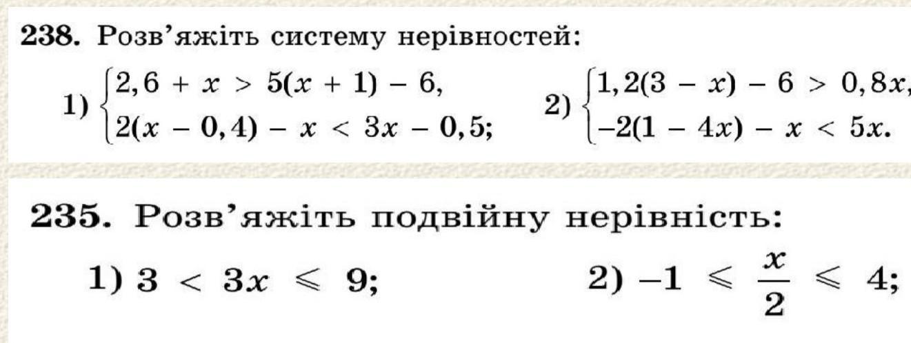 235 . 1) 3 < 3x ≤ 9 ; │: 3 2) - 1 ≤ x/2 ≤ 4 ; │X 2
