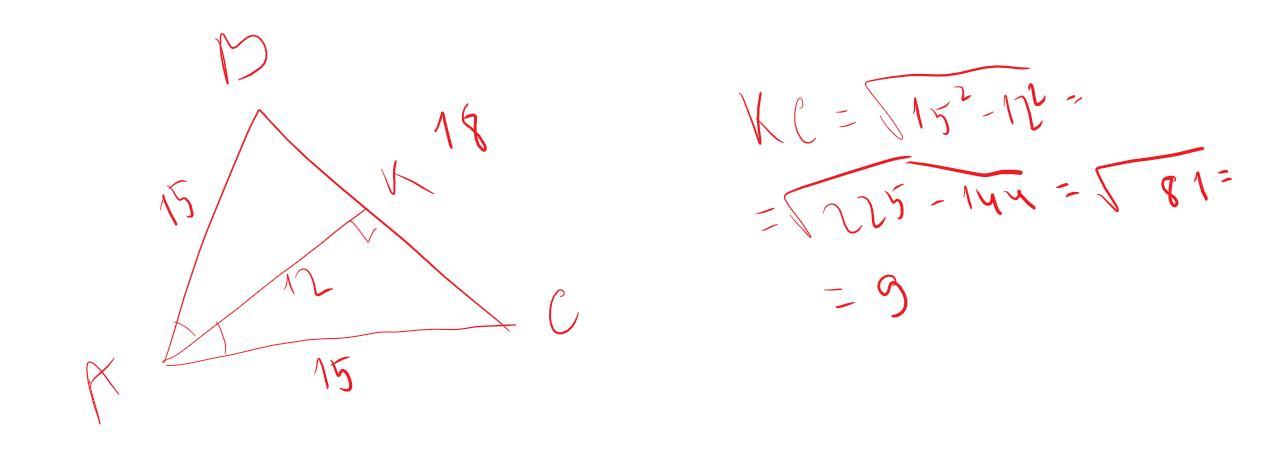 Биссектриса AKAK треугольника ABC ABC делит сторону BCBC на отрезки BKBK и KCKC . Найди длину отрезка KCKC , если AC=AB=15AC=AB=15 , BC=18BC=18 и AK=12