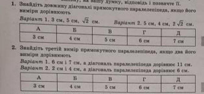 1)Найдите длину диагонали прямоугольного параллелепипеда ,если его измерения равны 2.5 см,4 см,2√2см. 2)Найдите третье измерение прямоугольного параллелепипеда,если его измерения равны 2.2 см и 4 см,а диагональ параллелепипеда 6см.