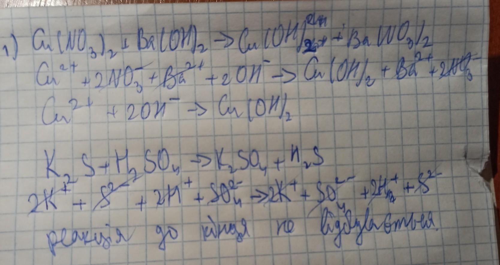 1. Складіть йонно-молекулярні рівняння реакцій, що відповідають таким молекулярним рiвнянням: a) Cu(NO3)2 + Ba(OH)2 = Cu(OH)2+ + Ba(NO3)2; б) K2S + H2SO4 = K2SO4 + H2St;