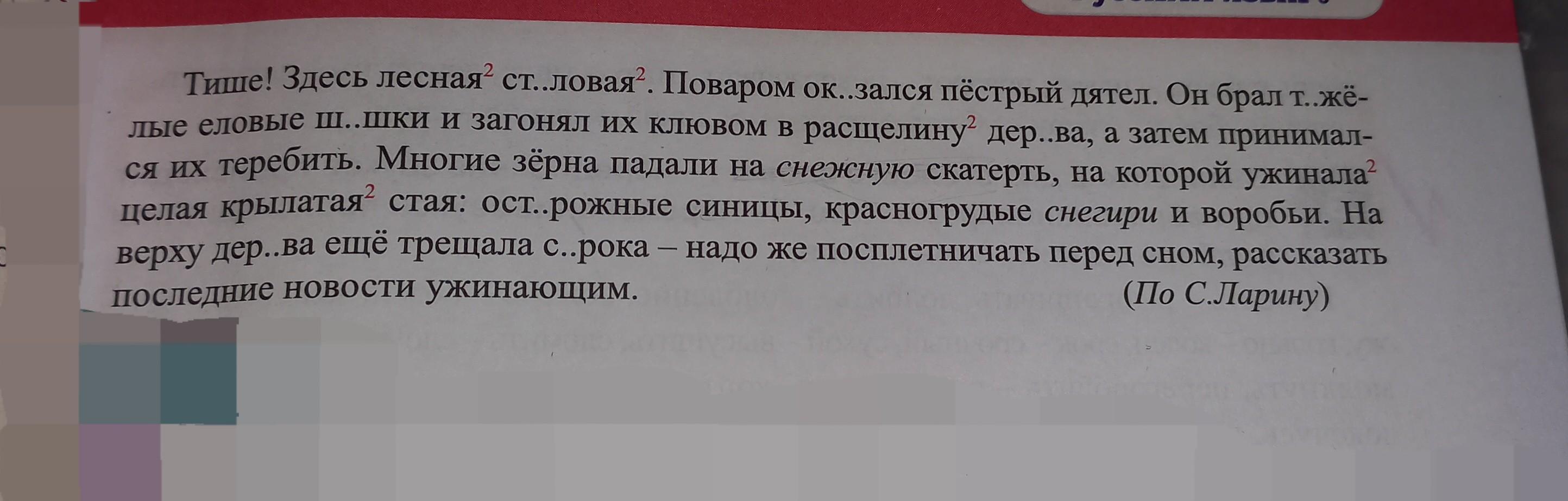 Тише! Здесь лесная столовая (стол). Поваром оказался (ка'жется) пёстрый дятел. Он брал тяжёлые (тя'жесть) еловые шишки (жи-ши) и загонял их клювом в расщелину дерева (дере'вья), а затем принимался их теребить. Многие зёрна падали на снежную скатерть, на которой ужинала целая крылатая стая: осторожные (сто'рож) синицы, красногрудые снегири и воробьи. На верху дерева (дере'вья) ещё трещала сорока (словар.) — надо же посплетничать перед сном, рассказать последние новости ужинающим.