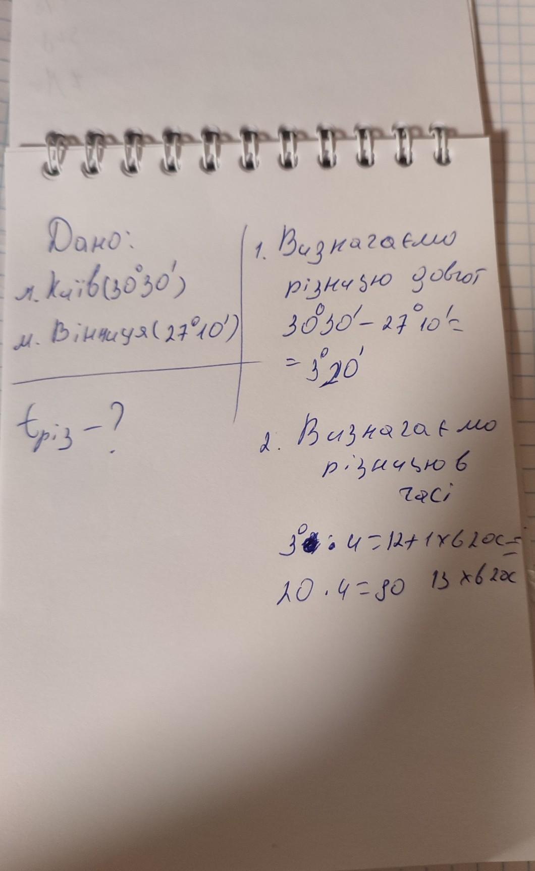 Визначте на скільки хвилин відрізняється місцевий час у м. Києві (30º 30' сх. д.) і в м. Вінниці (28° 70' сх. д.).