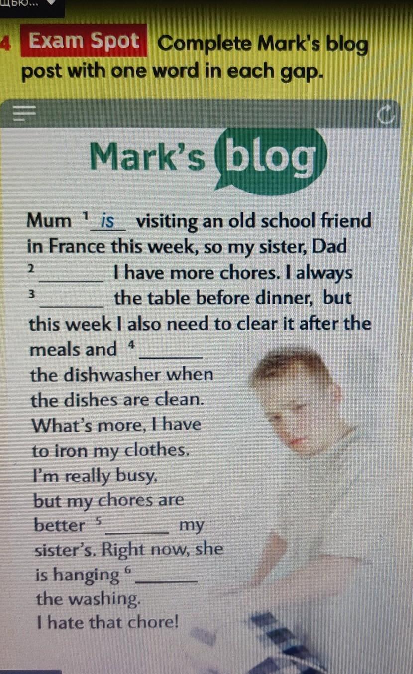 Q 4 Exam Spot Complete Mark's blog post with one word in each gap. Mark's blog Mum¹ is visiting an old school friend in France this week, so my sister, Dad 2 I have more chores. I always the table before dinner, but this week I also need to clear it after the meals and 4 3 the dishwasher when the dishes are clean. What's more, I have to iron my clothes. I'm really busy, but my chores are better 5 my sister's. Right now, she 6 is hanging the washing. I hate that chore! пжжжжжжд прошууууууууууууу