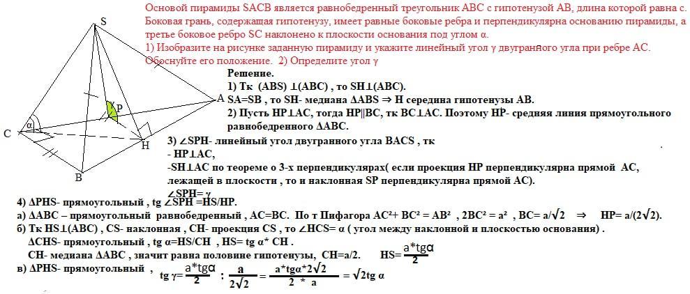1) Изобразите на рисунке заданную пирамиду и укажите линейный угол γ двугранного угла при ребре АС. Обоснуйте его положение.