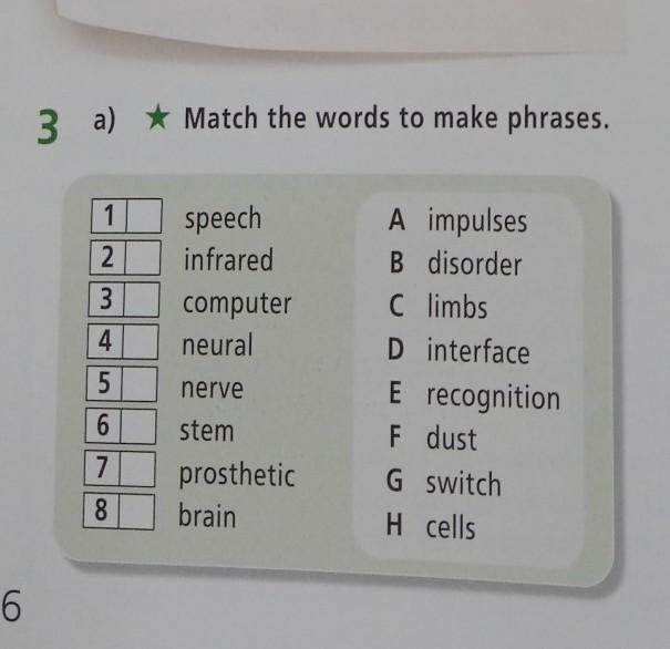 16 3 a) ★ Match the words to make phrases. 1 2 3 4 5 6 7 8 speech infrared computer neural nerve stem prosthetic brain A impulses B disorder C limbs D interface E recognition F dust G switch H cells