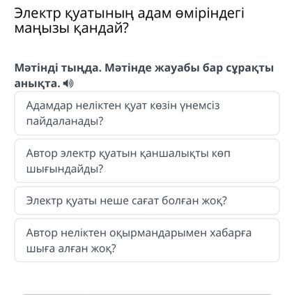 Мәтінді тыңда. Мәтінде жауабы бар сұрақты
