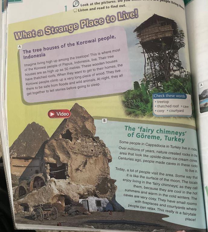 2 9.4.5.1 Read the text and answer the questions. 1 What are the tree houses of the Korowai people made of? 2 How do the Korowai people get into their houses? 3 4 Why are their houses so high? What do the Korowai do at night? 6 5 Where are the 'fairy chimneys'? What do the 'fairy chimneys' look like? 7 What does the landscape there look like? 8 Why do people enjoy living in the 'fairy chimneys'?