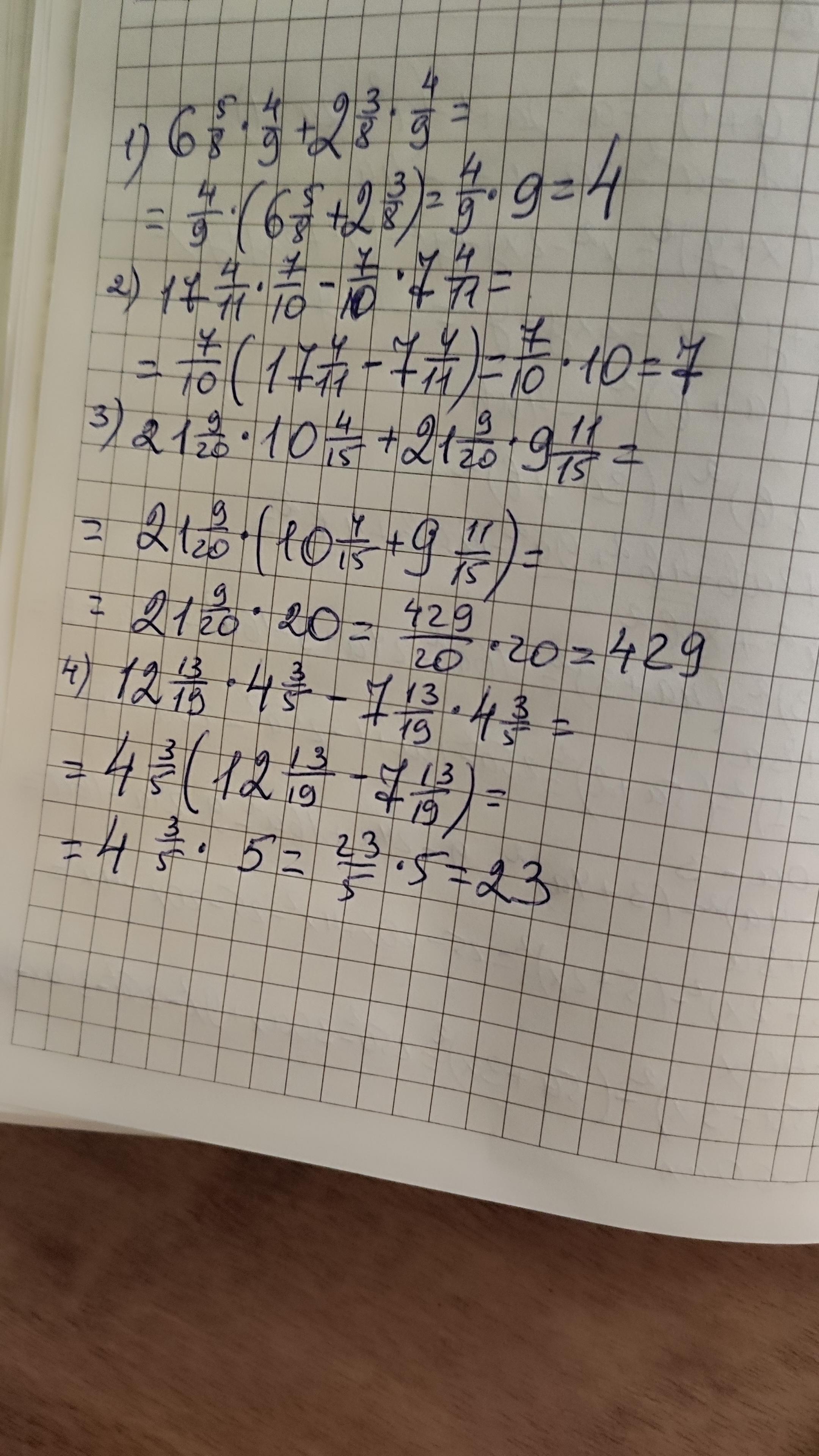 вычислите удобным способом : 1) 6 5/8 * 4/9 + 2 3/8 * 4/9 , 2) 17 4/11 * 7/10 - 7/10 * 7 4/11 , 3) 21 9/20 * 10 4/15 + 21 9/20 * 9 11/15 , 4) 12 13/ 19 * 4 3/5 - 7 13/19 * 4 3/5