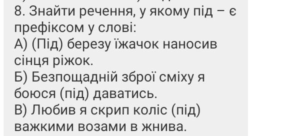 Знайти речення, у якому під — є префіксом у слові: А) (Під) березу їжачок наносив сінця ріжок. Б) Безпощадній зброї сміху я боюся (під) даватись. В) Любив я скрип коліс (під) важкими возами в жнива.