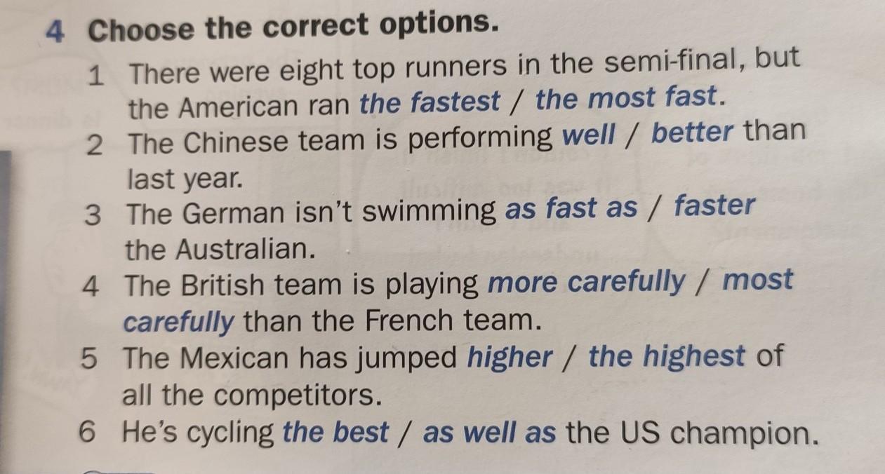 1; But The American Ran THE FASTEST. 2; The Chinese Team is Performing WELL than last year. 3; The German Isn't Swimming AS FAST AS the Australian 4; The British Team is playing MORE CAREFULLY than French Team. 5; The Mexican Has Jumped THE HIGHEST of all the competitors. 6; He's Crying AS WELL AS the Us