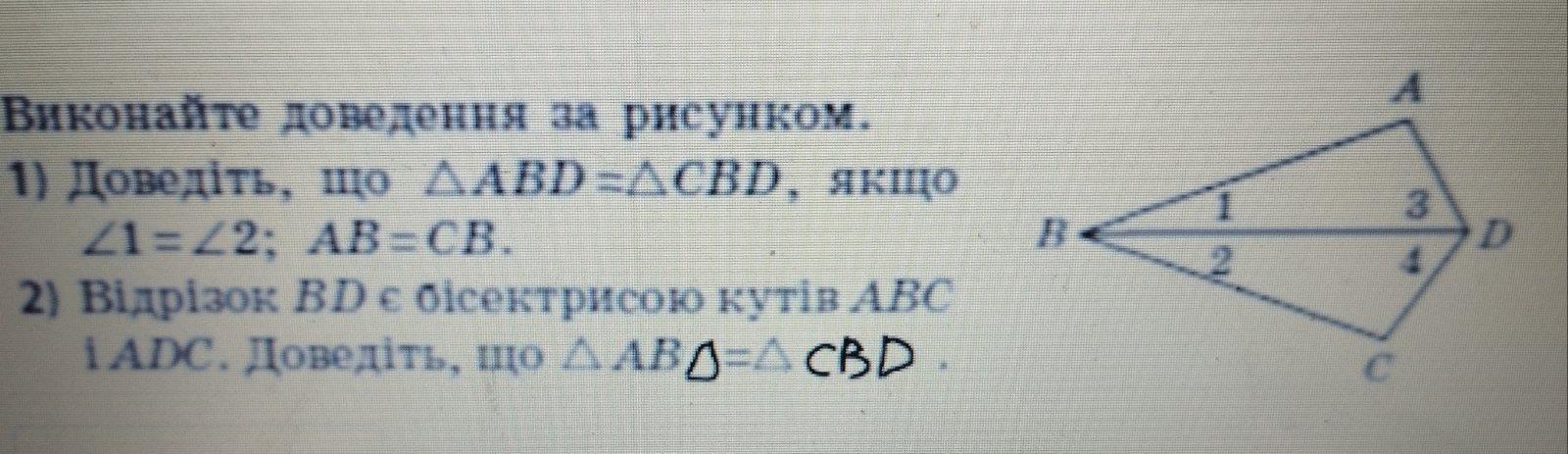 ΔАВС=ΔСВD (за 2 сторонами і кутом між ними BD - спільна; ∠1=∠2; АВ=СВ
