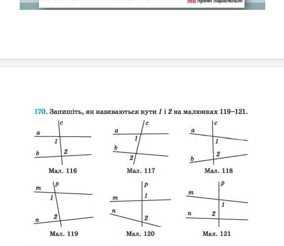 170. Запишіть, як називаються кути 1 і 2 на малюнках 119-121. a b m п с 1 2 Мал. 116 Мал. 119 a b m п 1 2 Мал. 117 P 1 2 Мал. 120 a b m 72 2 Мал. 118 2 1 Мал. 121