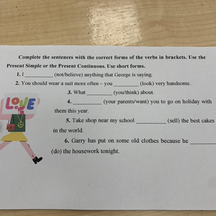 1) I DIDN'T BELIEVE anything that George Said. 2) You should wear a suit more often - you're looking very handsome 3) What are you thinking about 4) Your parents wanted you to go on holiday with them this year. 5) Take shop near my school selling the best cakes in the world 6) Gary has put on some old clothes because he did the housework tonight